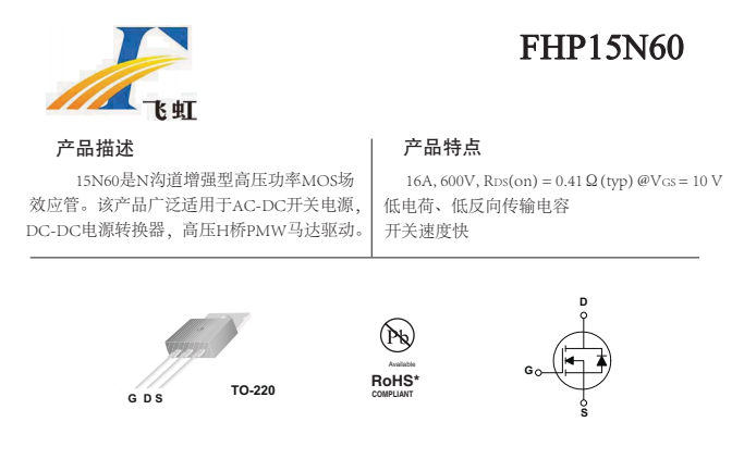 FHP15N60的主要封裝形式是TO-220、TO-220F、TO-3PN,腳位排列位GDS。這款15N60場效應(yīng)管產(chǎn)品具體參數(shù):Vgs(±V):30;VTH(V):3-5;ID(A):16;BVdss(V):600。RDS (on) = 0.41mΩ(typ)@V GS =10V,低電荷、低反向傳輸電容開關(guān)速度快的特點。