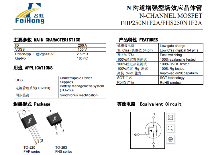 FHP250N1F2A的封裝形式是TO-220、TO-263。這款產品參數:VTH(V):2-4;ID(A):250;BVdss(V):100、Vgs(±V):20;。